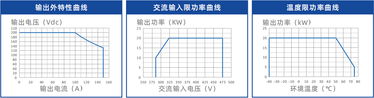名称 参数 基本指标 尺寸 85mm(高)×226mm(宽)×390mm(深) 重量 ≤ 11kg 效率 ( 满载 ) >95.5% 静态功耗 < 8W 散热方式 强制风冷 通信方式 CAN 总线 并机数量 ≤ 60 个 指示灯 绿色 : 正常运行 黄色 : 保护报警 红色 : 故障报警 输入特性 输入电压 285Vac ~ 475Vac,三相 + 保护地 输入电流 < 40A 电网频率 45Hz ~ 65Hz 功率因数 ≥ 0.99 ITHD ≤ 5% 输出特性 输出功率 20kW@输出电压≥133.3Vdc 电压范围 60Vdc~ 200Vdc,缺省值:60Vdc 电流范围 0A ~ 150A 稳压精度 ≤ ±0.5% 稳流精度 ≤ ±1% 均流不平衡度 ≤ ±5% 纹波峰峰值 ≤ 1% 环境条件 工作温度 - 40℃~+ 75℃,50℃不降额 储存温度 - 40℃~+ 75℃ 相对湿度 ≤ 95% RH,无冷凝 海拔高度 ≤ 2000m 无需降额 ;>1000m需设置实际海拔值 , 每升高 100m工作温度降低 1℃ MTBF >500,000 小时 告警及保护 输入过 / 欠压 关机可自动恢复 输出过压 关机需手动恢复 过流及短路 关机需手动恢复 过温 关机可自动恢复